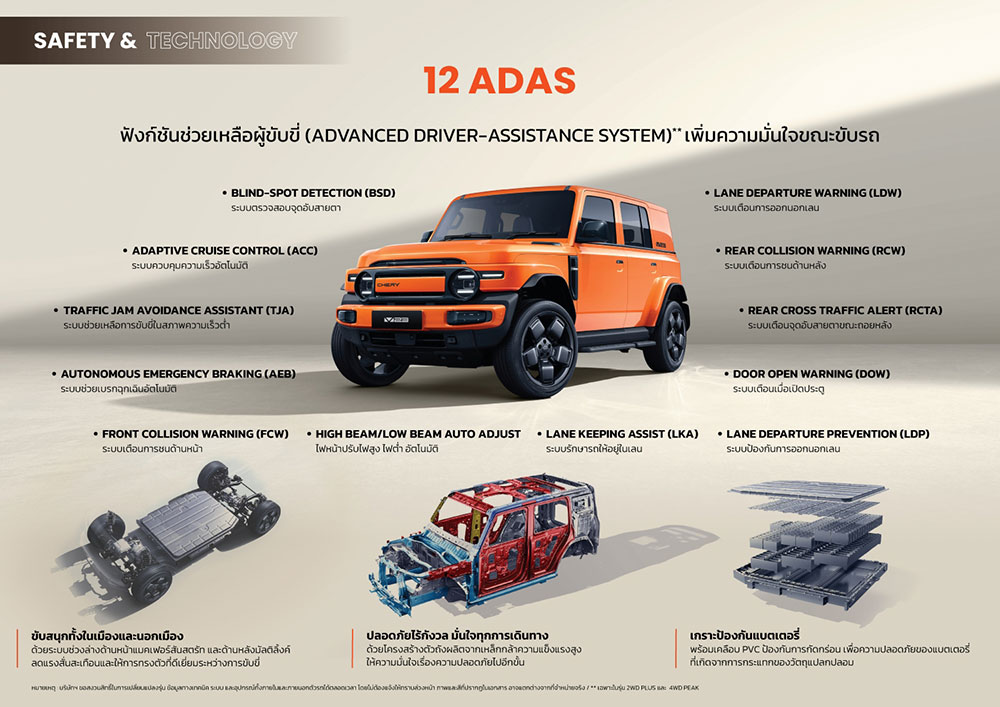• CHERY V23 4WD PEAK ติดตั้งแบตเตอรี่ขนาด 81.76 กิโลวัตต์ ให้กำลังสูงสุด 211 แรงม้า แรงบิดสูงสุด 292 นิวตัน-เมตร ระยะการขับสูงสุด 430 กิโลเมตร/ชาร์จ (มาตรฐาน NEDC) ราคา 889,900 บาท