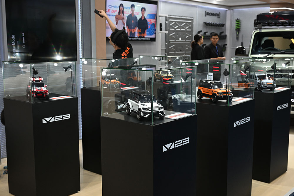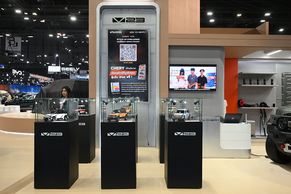 • CHERY ยังคงตอกย้ำบทบาทในการผลักดันพลังแห่งความคิดสร้างสรรค์ โดยภายในบูท CHERY HAPPINESS HUB จัดแสดง 6 โมเดลผลงานการออกแบบอุปกรณ์ตกแต่งรถ Chery V23 จาก 6 ไฟนอลลิสต์จากโครงการ Chery V23 Style Up Challenge ที่ก่อนหน้านี้เปิดเวทีให้นักศึกษาและบุคคลทั่วไปได้ร่วมส่งผลงานการดีไซน์ที่เปี่ยมคาแรกเตอร์และมีศักยภาพในการนำไปใช้จริงในเชิงพาณิชย์
