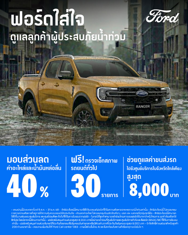 • ฟอร์ด ประเทศไทย ส่งแคมเปญช่วยเหลือลูกค้าผู้ประสบภัยน้ำท่วม มอบส่วนลดสูงสุดถึง 40% ค่าอะไหล่ และน้ำมันหล่อลื่น