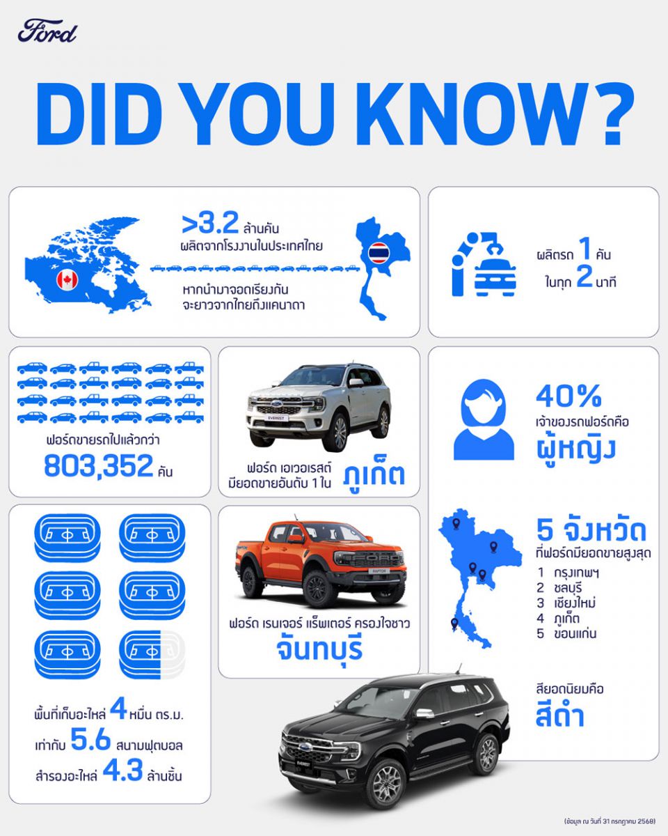 • นับตั้งแต่วันแรกที่เริ่มดำเนินธุรกิจในเมืองไทยจนถึงปัจจุบัน ฟอร์ดส่งมอบรถยนต์ให้ลูกค้าชาวไทยไปแล้วกว่า 803,352 คัน (ข้อมูล ณ วันที่ 31 กรกฎาคม 2568) เป็นตัวเลขที่สะท้อนถึงความไว้วางใจอย่างต่อเนื่องจากผู้บริโภค