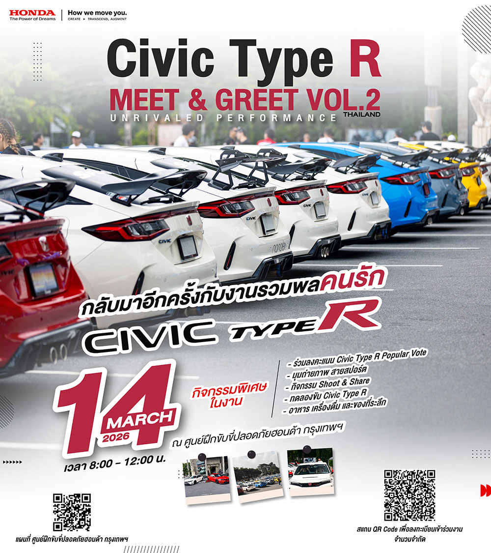 • บริษัท ฮอนด้า ออโตโมบิล (ประเทศไทย) จำกัด จัดงานรวมตัวครั้งยิ่งใหญ่ของชาวแฟน ๆ สายสปอร์ตคนรัก Honda Civic Type R ในกิจกรรม Honda Civic Type R Fan Meet #2: The Unrivaled Performance ในวันเสาร์ที่ 14 มีนาคม 2569 ณ ศูนย์ฝึกขับขี่ปลอดภัยฮอนด้า ถนนรามคำแหง