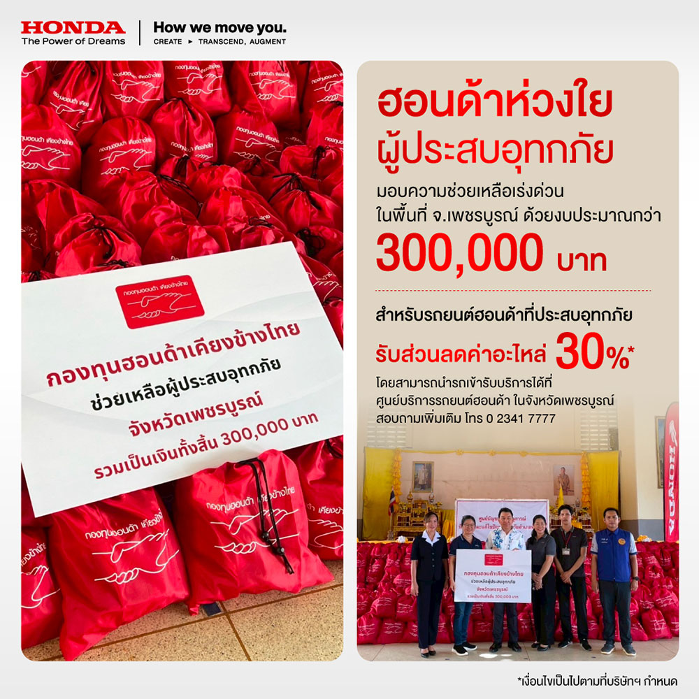 • กองทุนฮอนด้าเคียงข้างไทย ส่งมอบถุงยังชีพให้แก่ คุณศรัณยู มีทองคำ ผู้ว่าราชการจังหวัดเพชรบูรณ์ ณ ที่ว่าการอำเภอหล่มสัก เพื่อนำไปแจกจ่ายช่วยเหลือผู้ประสบภัยในพื้นที่ รวมมูลค่าความช่วยเหลือกว่า 300,000 บาท แสดงถึงความมุ่งมั่นของกองทุนในการยืนหยัดเคียงข้างประชาชนไทยในยามวิกฤต