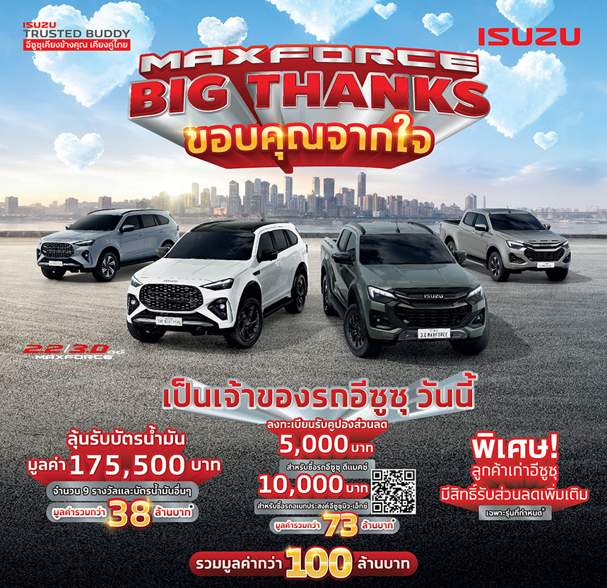 • อีซูซุได้จัดแคมเพจ์นใหญ่ ส่งท้ายปี “MAXFORCE BIG THANKS ขอบคุณจากใจ” มอบบัตรน้ำมัน PT สำหรับลูกค้าที่ซื้อและรับรถปิกอัพอีซูซุ ดีแมคซ์ ทุกรุ่น หรือรถยนต์นั่งอเนกประสงค์มิว-เอ็กซ์ทุกรุ่น ระหว่างวันที่ 25 ตุลาคม - 30 ธันวาคม 2568 มูลค่ารวมกว่า 38,700,900 บาท พร้อมสิทธิพิเศษเพิ่มเติมสำหรับผู้ที่สนใจซื้อรถอีซูซุในช่วงเวลาดังกล่าว