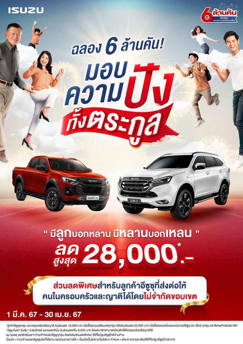 • เชิญชวนลูกค้าผู้ใช้รถปิกอัพ และรถยนต์นั่งอเนกประสงค์อีซูซุทุกรุ่น แนะนำส่วนลดพิเศษให้คนในครอบครัว และญาติ โดยไม่จำกัดขอบเขต หรือออกรถเอง ก็รับส่วนลดสูงสุดถึง 28,000 บาท ตั้งแต่วันที่ 1 มีนาคม 2567 - 30 เมษายน 2567