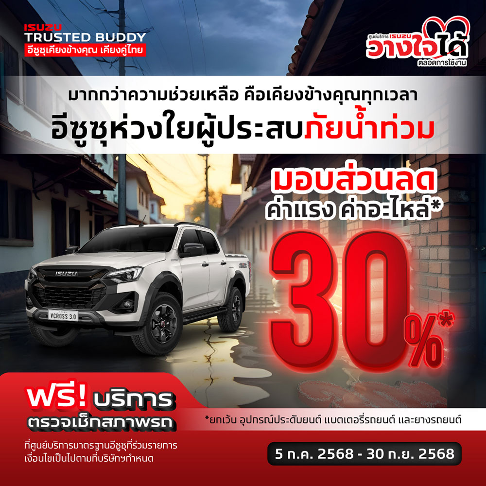 • อีซูซุยังได้ร่วมบรรเทาความเดือดร้อนให้ท่านผู้ใช้รถอีซูซุที่ได้รับผลกระทบจากภัยน้ำท่วมในจังหวัดต่าง ๆ โดยการมอบบริการตรวจเช็กสภาพรถฟรี พร้อมมอบส่วนลดค่าแรง 30% และส่วนลดค่าอะไหล่ 30% (ยกเว้น อุปกรณ์ประดับยนต์ แบตเตอรี่รถยนต์ และยางรถยนต์) ตั้งแต่วันที่ 5 กรกฎาคม 2568 - 30 กันยายน 2568