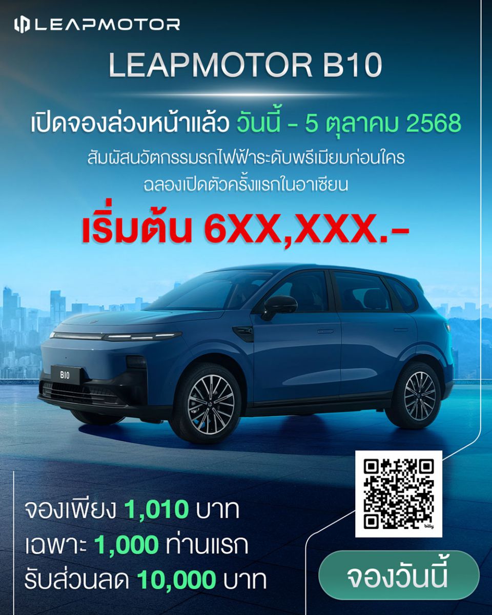 • ลูกค้าที่สนใจสามารถจองสิทธิ์เป็นเจ้าของ Leapmotor B10 ได้แล้ววันนี้ ! เพียง 1,010 บาท จำกัดเพียง 1,000 สิทธิ์เท่านั้น พร้อมรับส่วนลดอีก 10,000 บาท ตั้งแต่วันนี้จนถึงวันที่ 5 ตุลาคมนี้ ออกรถภายในวันที่ 31 ตุลาคม 2568