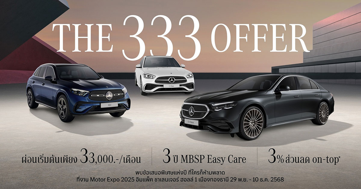 • ตัวเลข 333 จึงกลายเป็นแคมเปญโปรโมชั่นล่าสุดของเมอร์เซเดส-เบนซ์ ที่มีชื่อว่า “The 333 Offer” รับกระแสงาน Motor Expo 2025 ด้วยข้อเสนอแห่งปีสำหรับยนตรกรรมปลั๊กอินไฮบริดทั้ง 3 รุ่น