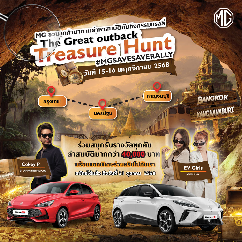 • MG ชวนลูกค้า MG3 HYBRID+ และ MG4 ELECTRIC ร่วมสนุกลุ้นเป็นหนึ่งใน 20 คัน ออกเดินทางตามล่าหาสมบัติไปกับกิจกรรม “#MGSAVESAVERALLY” เส้นทางกรุงเทพฯ-นครปฐม-กาญจนบุรี ในวันที่ 15-16 พฤศจิกายน 2568
