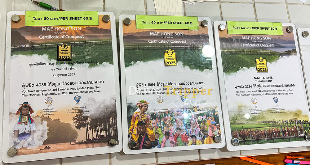 • เข้าเมืองแม่ฮ่องสอน อย่าลืมไปรับใบประกาศนียบัตร การผ่านหลายพันโค้ง ที่หอการค้าจังหวัดแม่ฮ่องสอน อยู่ใกล้กับปั๊ม ปตท.