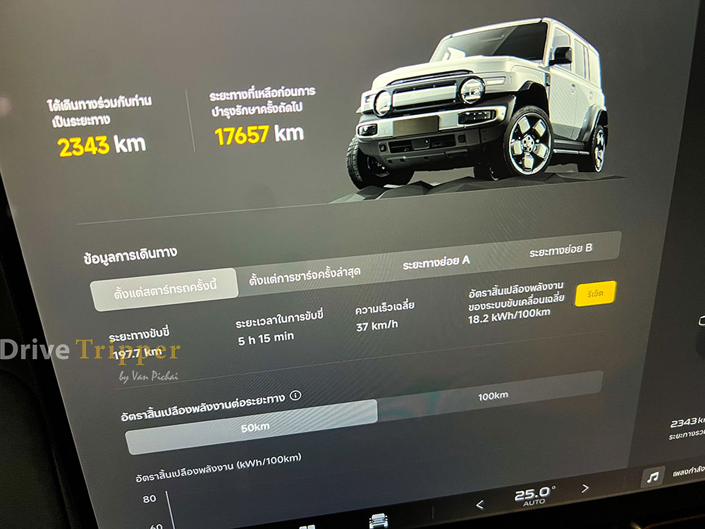• ใช้งานจริงขับขี่ได้ระยะทาง 309 กิโลเมตร พลังไฟฟ้าเหลือ 27% (116 กิโลเมตร)