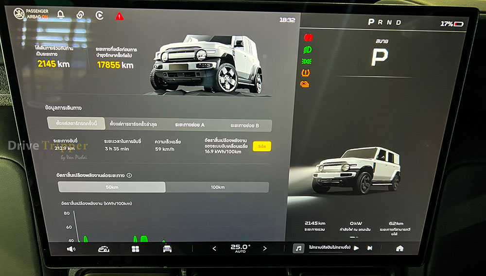• CHERY V23 2WD PLAY ขับขี่เป็นระยะทาง 212.9 กิโลเมตร พลังไฟฟ้าเหลือ 17% (62 กิโลเมตร)