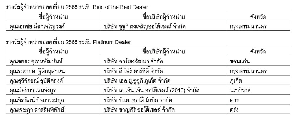 • ปีนี้มีผู้จำหน่ายที่ได้รับรางวัลรวมทั้งสิ้น 7 แห่งทั่วประเทศ สะท้อนถึงความมุ่งมั่นของซูซูกิในการยกระดับมาตรฐานเครือข่ายผู้จำหน่ายให้สอดรับกับทิศทางอุตสาหกรรมยานยนต์โลก และเตรียมความพร้อมรองรับแผนการเปิดตัวรถยนต์พลังงานทางเลือก รวมถึงรถยนต์ไฟฟ้า (EV) ในอนาคต