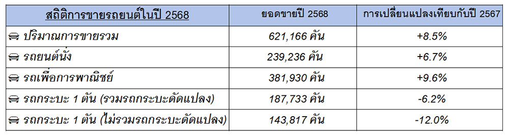 • มีตัวเลขยอดขายรวมในปี 2568 อยู่ที่ 621,166 คัน หรือเพิ่มขึ้น 8.5% เมื่อเทียบกับปี 2567