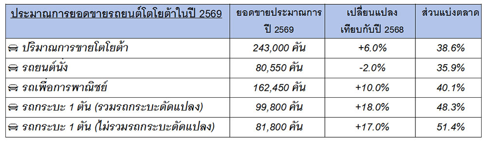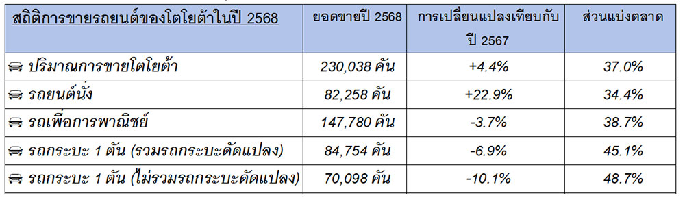 • ยอดขายของโตโยต้าในปี 2568 มียอดขายโดยรวมอยู่ที่ 230,038 คัน หรือเพิ่มขึ้น 4.4% เมื่อเทียบกับปีที่ผ่านมา