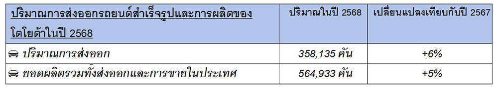 ปริมาณการส่งออกรถยนต์และการผลิตของโตโยต้าในปี 2568