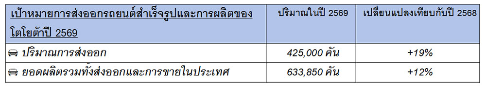 เป้าหมายการส่งออกรถยนต์และการผลิตของโตโยต้าในปี 2569