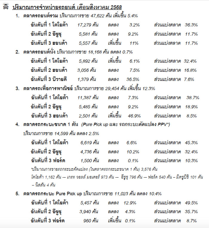 • ตลาดรถยนต์เดือนสิงหาคม 2568 มียอดขาย 47,622 คัน เพิ่มขึ้น 5.4% เมื่อเทียบกับช่วงเดียวกันของปีที่แล้ว