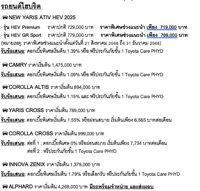 • บริษัท โตโยต้า มอเตอร์ ประเทศไทย จำกัด เข้าร่วมแสดงรถยนต์ในงาน BIG MOTOR SALE 2025 วันที่ 22-31 สิงหาคม 2568 ไบเทค บางนา